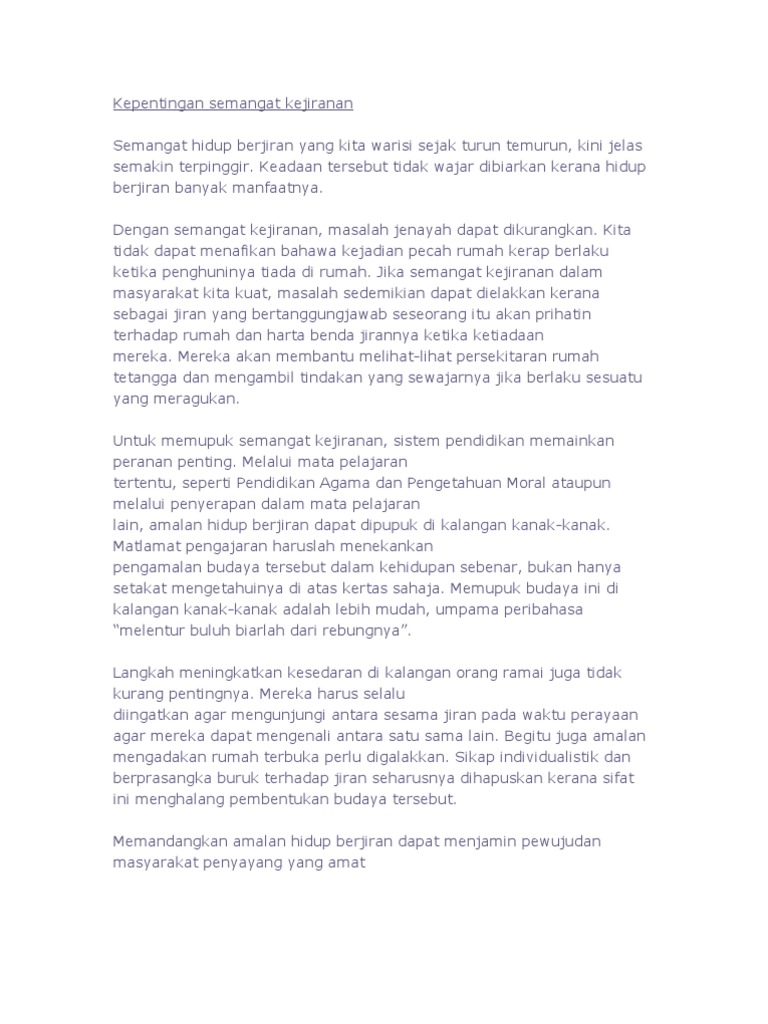 Semasa menghadiri rumah terbuka juga, para tetamu yang terdiri daripada pelbagai kaum akan memahami budaya dan adat resam kaum lain. Kepentingan dan manfaat amalan membaca kepada masyarakat. Kepentingan dan kebaikan amalan membaca kepada masyarakat. Tempias daripada amalan rumah terbuka ini menyebabkan suburnya hubungan silaturahim dalam masyarakat. Karangan 38 isu pengangguran telah menjadi satu isu sensitif kepada masyarakat terutama golongan siswazah. Kebaikan dan kepentingan makanan seimbang kepada tubuh badan. (mengapa) perpaduan yang terjalin sekali gus dapat memudahkan pencapaian matlamat atau misi. Seterusnya, melalui majlis rumah terbuka ini, semua ahli dalam masyarakat berpeluang untuk berkumpul dan berbincang sambil menikmati juadah yang disediakan oleh tuan rumah. Peperiksaan percubaan smk sungai karangannegara kita amat tersohor dengan keunikan pelbagai budaya bangsa. Page 2 read kepentingan hidup berjiran from the story contoh karangan bm by christabeljuman sebagai contohnya, pada sambutan hari kemerdekaan, majlis rumah terbuka dan sambutan amalan yang murni ini menjadikan negara kita unik pada pandangan masyarakat di luar sana malah. Pada era globalisasi ini, masyarakat seakan terlalu sibuk mengejar kemewahan duniawi lantas sering mengabaikan amalan gaya hidup sihat terutamanya amalan beriadah atau rekreasi. Selain itu, amalan rumah terbuka memberikan makna besar kepada anggota masyarakat mengenai erti perpaduan yang harus wujud untuk mengelakkan sebarang prejudis terhadap keharmonian kaum. Sebagai sebuah negara yang mempunyai masyarakat pelbagai kaum, agama, dan budaya yang berlainan, perpaduan amat penting dalam mencapai matlamat pembangunan negara.